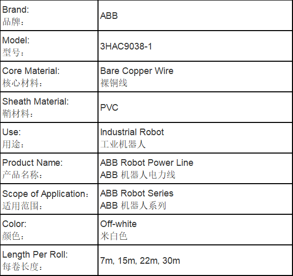 ABB 机器人动力电缆,ABB 机器人用线束动力电缆,全新 ABB 机器人动力电缆。外层护套:PUR;整体屏蔽,ABB 电源线 3HAC040503,ABB 机器人电缆 3HAC040503-001,机器人电缆定制。